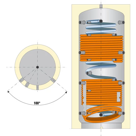 2 échangeurs tubulaires en acier pour une séparation hydrauliques des circuits. (circuits glycolés).4×2 piquages principaux. 5 piquages pour sondes, thermometres. Déflecteurs à labyrinthe pour une excellente stratification.