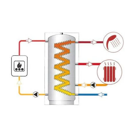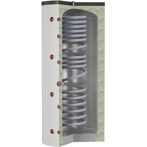 Revêtement extérieur : skaï gris Prise prévue pour appoint électrique 1 serpentin en inox 316L pour la production d’ECS.4×2 piquages principaux 5 piquages pour sondes, thermometres Déflecteurs à labyrinthe pour une excellente stratification
