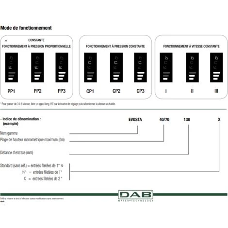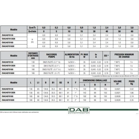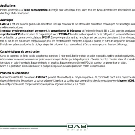 Liquide pompé : Propre, dépourvu de toute substance solide et trace d’huile minérale, non visqueux, chimiquement neutre, proche des caractéristiques de l’eau (glycol max. 30 %)