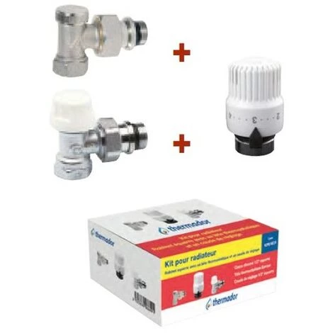 KITS RADIATEURS 3 PIÈCES Kit pour radiateur : robinet avec tête thermostatique • Tête thermostatique TTE. • Corps chromé avec douille auto-étanche. • Coude ou té de réglage avec douille auto-étanche. Kit équerre inversé trois pièces pour radiateur 1/2′ K3PE15EICR