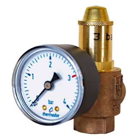 Soupape de sécurité pour chauffage et climatisation, avec manomètre monté.