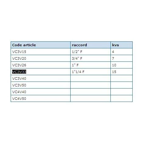 | Vanne 3 voies Thermomix 33×42 laiton Vannes THERMOMIX Vannes mélangeuses à secteur, pour chauffage, 3 voies, Corps laiton, axe acier inox, doubles joints toriques sur l’axe. Angle de rotation 90° Température maxi 110°C Pression maxi : 6 bar. Motorisable. |