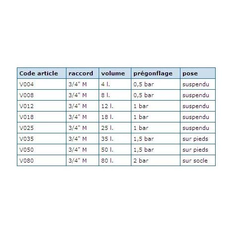 | Vase à membrane suspendu 12L THERMADOR – V012 Vases d’expansion fermés, à membrane pour chauffage et climatisation. CE à partir du 18 litres. Vases en acier, membrane SBR. Pression de service 4 bar, températures -10°C / 99°C Raccordement à l’installation :3/4″M |